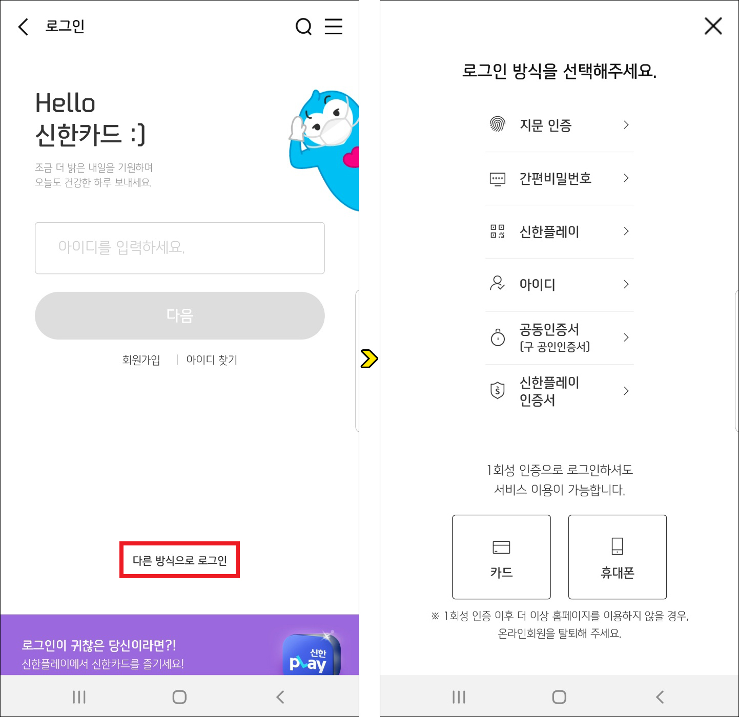 기본적으로 로그인을 해야 이용할 수 있는 서비스이니 아이디를 입력해서 접속하면 되고 없을 경우 [다른 방식으로 로그인]을 눌러 지문 인증, 간편비밀번호, 신한플레이, 공동인증서(구 공인인증서), 신한플레이 인증서 중에 편한 방식을 선택하면 되겠고요.(1회성 인증으로 카드나 휴대폰도 가능하며 공동인증서는 최초 등록 후 이용할 수 있음)