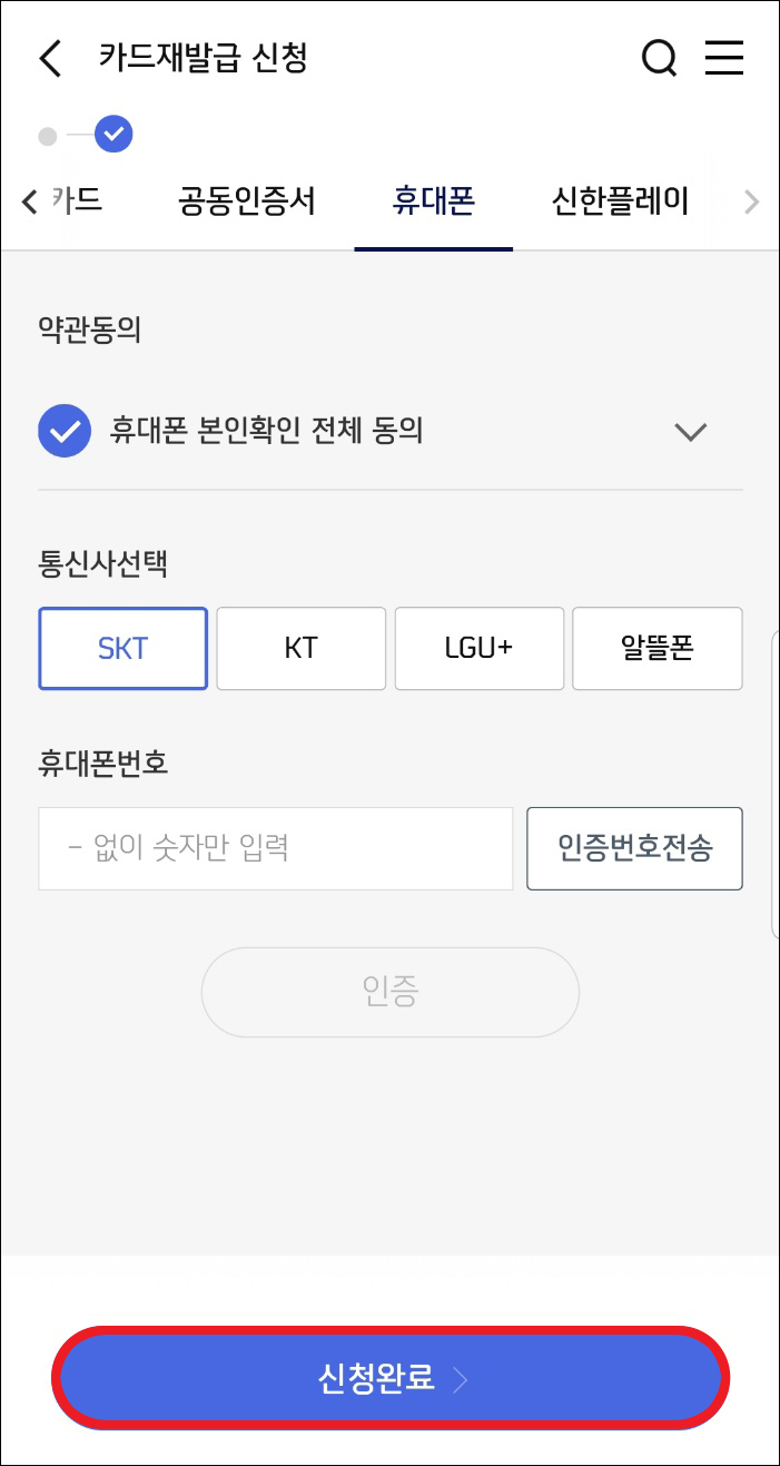 이어서 약관동의에 체크를 하고 통신사를 선택한 다음 휴대폰 번호를 입력해서 [인증번호 전송]을 누르고 확인하여 동일하게 입력 후 인증을 마치면 정상적으로 [신청완료]를 할 수 있으니 안내에 따라 진행하면 될 거예요.(인증방식은 카드, 공동인증서, 신한플레이 중에 선택해도 됨)