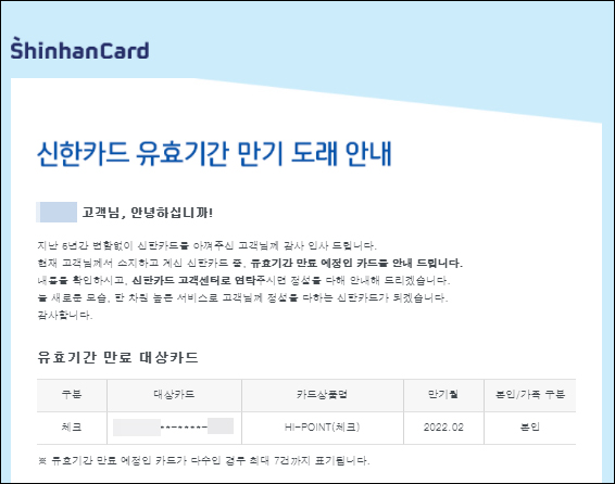 이번 시간은 신한카드 유효기간 만료로 갱신하여 재발급하는 법을 알려드리기 위한 정보성 포스팅을 준비했는데 카드를 사용하다 보면 5년이 지날 경우 유효기간 만기 예정을 알리는 안내문을 메일 또는 문자 메시지를 통해 받게 될 수 있습니다.