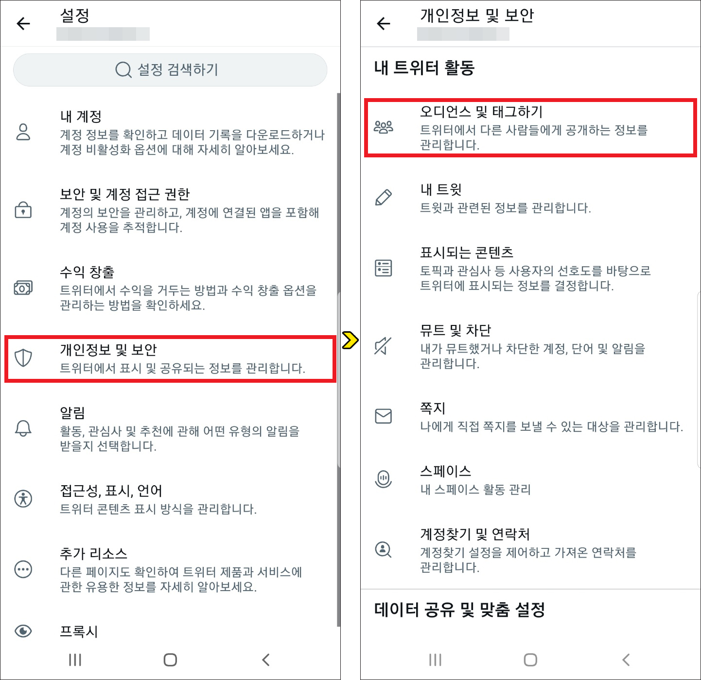 이어서 [개인정보 및 보안]을 눌러 넘어간 화면을 보면 내 트위터 활동 중 [오디언스 및 태그하기]를 찾을 수가 있으니 선택을 해주시면 되고요.