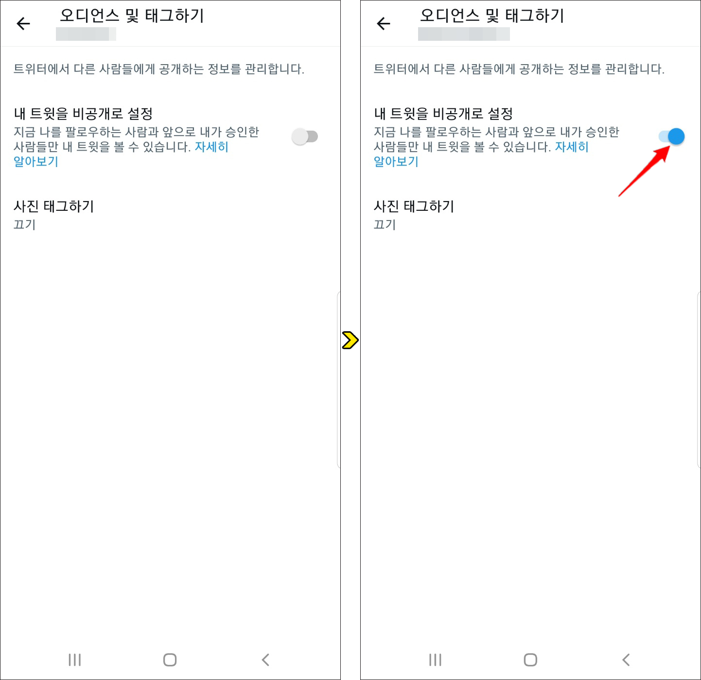 기본적으로 비활성화되어 있는 상태이지만 트위터 계정을 비공개로 설정하고 싶다면 이 버튼을 눌러서 활성화되도록 허용을 해주시면 되겠습니다.