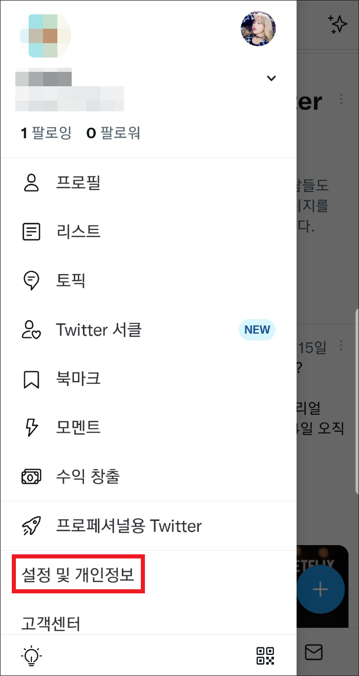 모바일 앱을 기준으로 알려드릴 텐데 일단은 트위터 앱을 실행하여 로그인한 다음 좌측 상단에 있는 프로필 사진을 누르고 메뉴가 열리면 [설정 및 개인정보]를 누릅니다.
