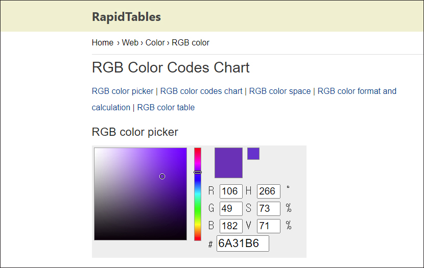 해당 페이지가 열리면 RGB color picker에서 원하는 색상을 미세하게 조절하여 찾아볼 수 있으니 확인해 보시면 되겠고요.