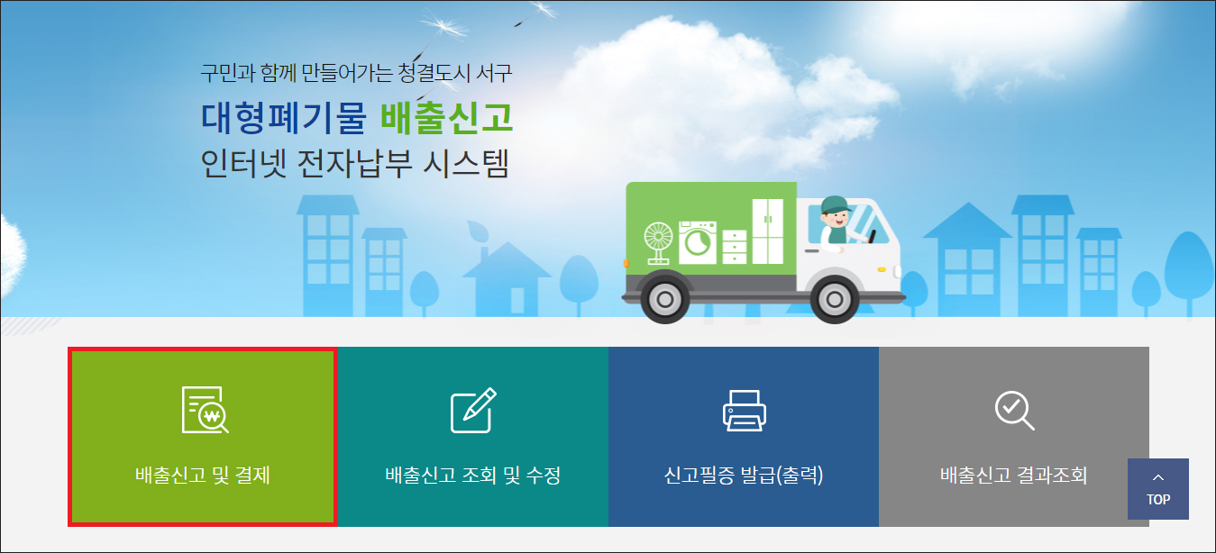 사이트를 살펴보면 배출신고와 같은 메뉴가 있는 걸 찾을 수 있는데 대전 서구청의 경우 [배출신고 및 결제]가 있는 걸 확인할 수 있었으므로 클릭을 해봤습니다.