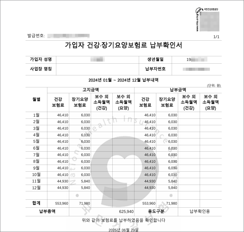 증명서 생성 후 2024년 1월~12월까지 납부한 건보료 총액을 확인하고 총액을 12개월로 나눴을 때 나온 금액이 상위 10% 기준선에 들어가는지 확인할 수 있을 거예요.