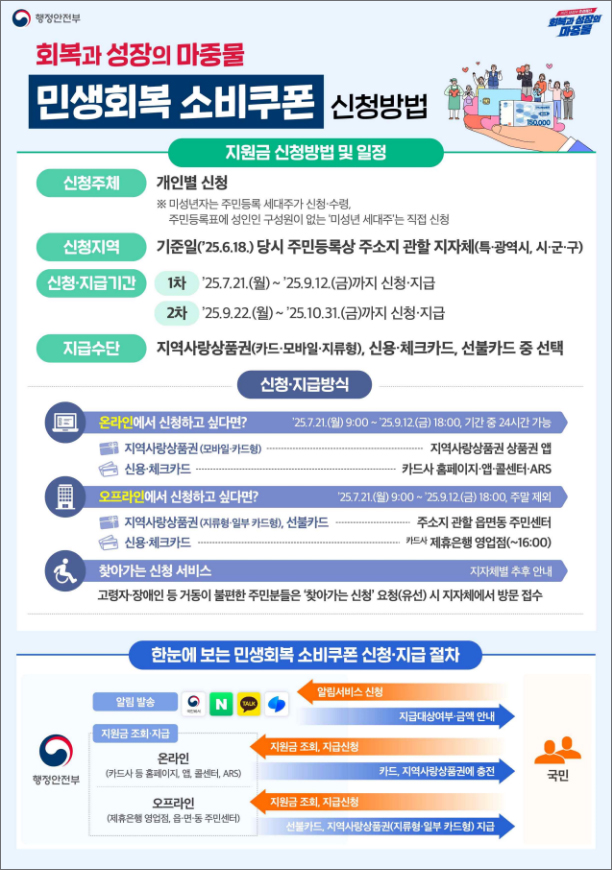 민생회복 소비쿠폰 1차 지급의 지급시기는 2025년 7월 21일 오전 9시~9월 12일 오후 6시까지로 약 8주간 진행됩니다.