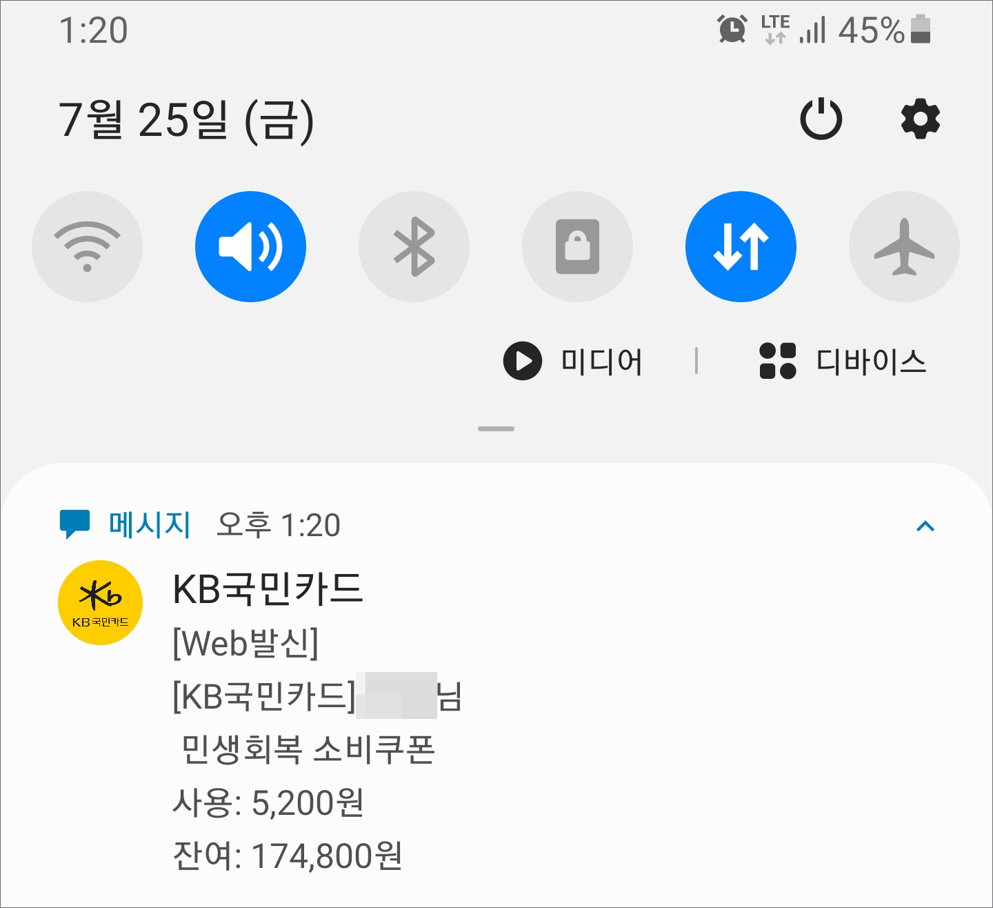 이후 가까운 편의점에 가서 5,200원짜리 도시락을 하나 사 먹었더니 KB국민카드에서 바로 메시지를 보냈는데 민생회복 소비쿠폰 사용 금액과 잔여 금액을 쉽게 확인할 수 있어 만족스러웠어요.