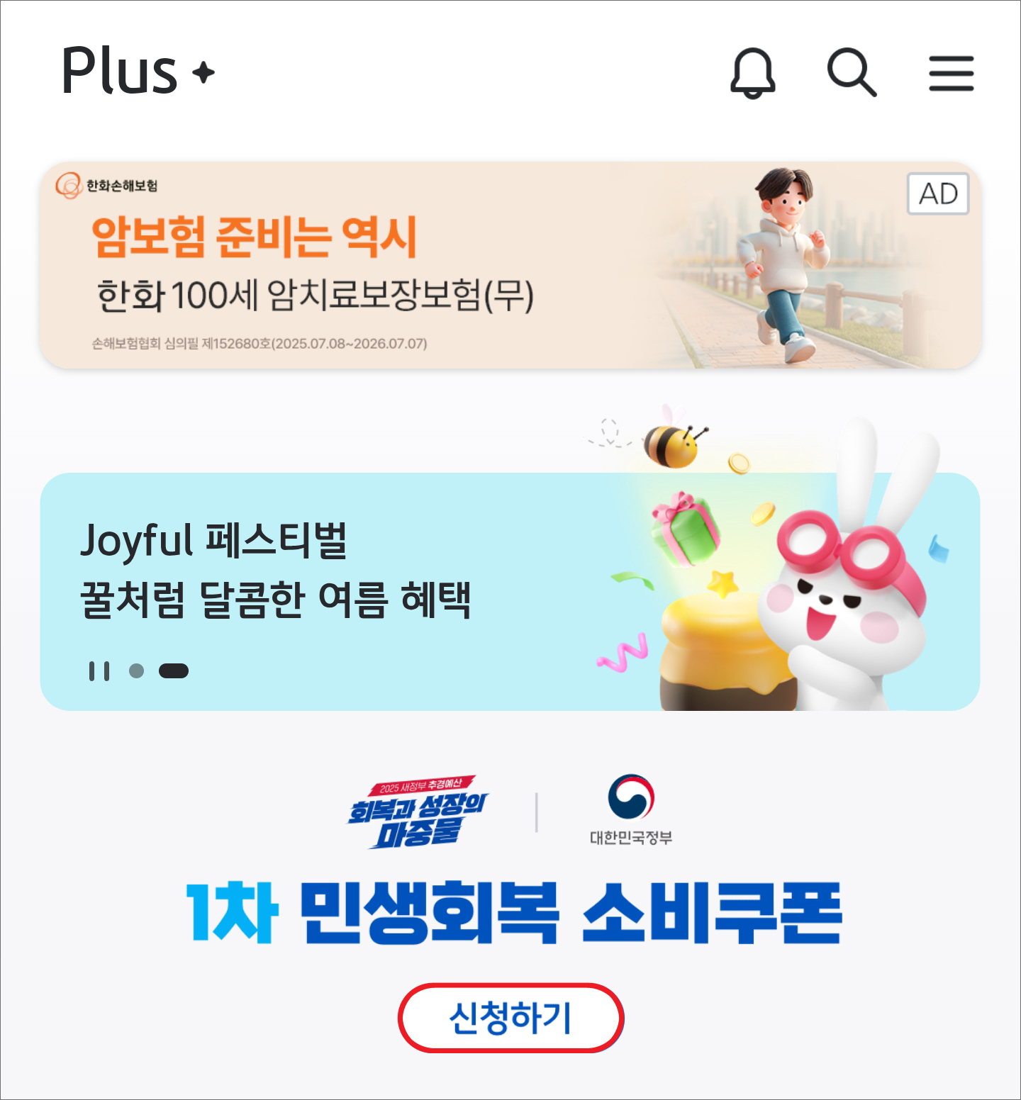 앱을 실행하면 첫 화면에 1차 민생회복 소비쿠폰이 정면에 보일 텐데 [신청하기] 버튼을 누릅니다.