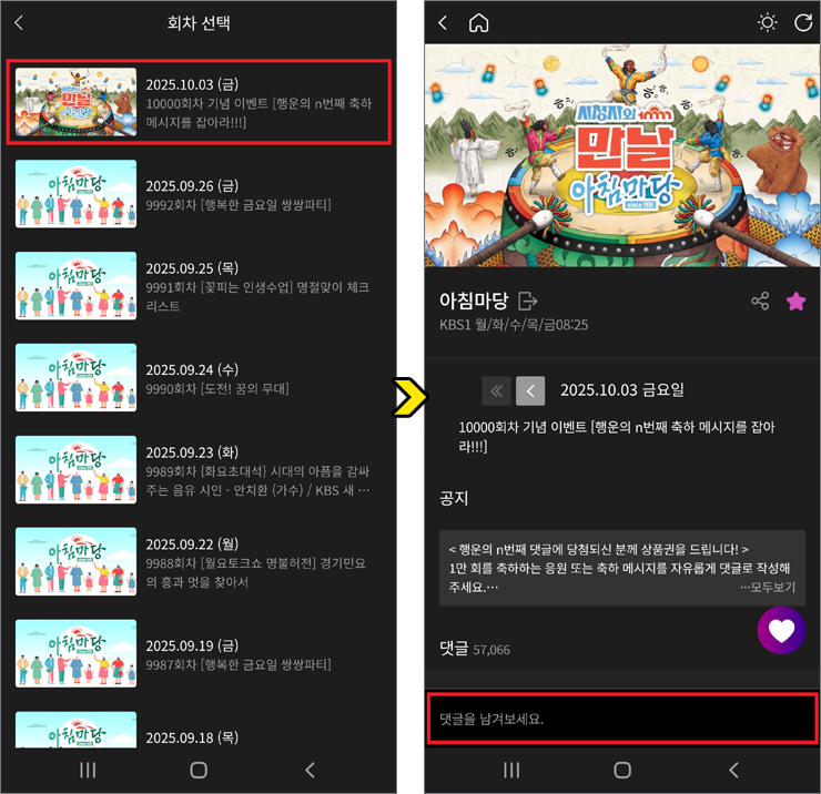 아침마당 이벤트 게시판이 나오면 아침마당 10000회를 축하하는 응원 또는 축하 메시지를 자유롭게 댓글로 작성하면 되는데요.