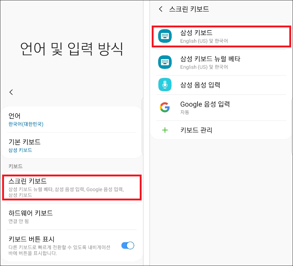 다음에 [스크린 키보드]를 눌러서 이동하여 [삼성 키보드]를 선택하면 되겠습니다.