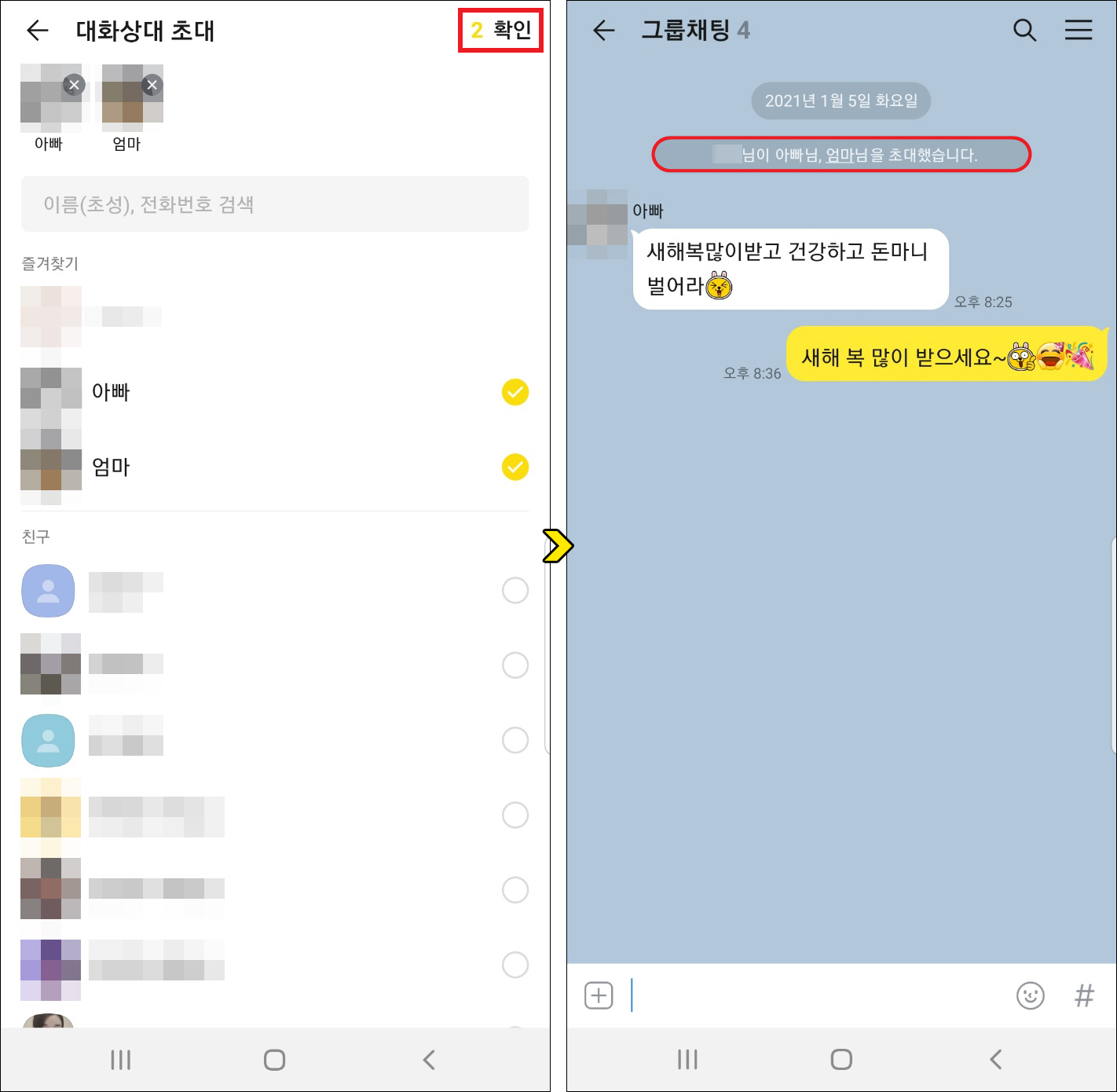 추가할 대상으로 여러 명을 선택해서 불러오는 것이 가능하니 찾아보시면 되고 체크된 상태를 살펴본 후 이상 없을 경우 우측 상단에 [확인]을 누르면 채팅방 상단에 누가 누구를 초대했다는 문구가 뜨게 될 것이며, 추가로 불러온 대상과 함께 채팅을 즐길 수 있을 것입니다.