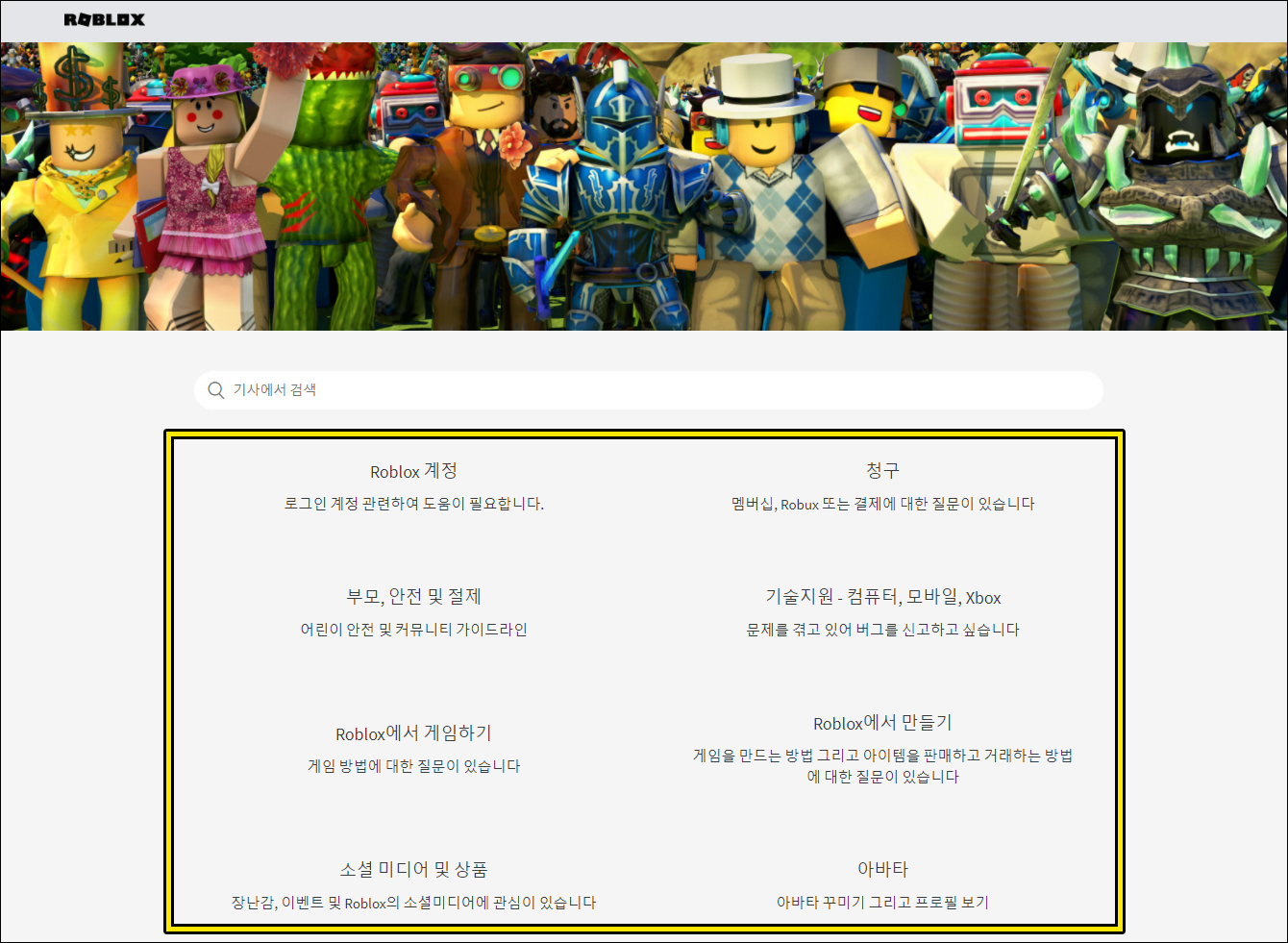 [기술지원-컴퓨터, 모바일, Xbox]는 문제를 겪고 있는 버그 신고하기, [Roblox 게임하기]는 게임 방법에 대한 질문, [Roblox에서 만들기]는 게임 만드는 법, 아이템 판매 및 거래 방법에 대한 질문, [소셜 미디어 및 상품]은 장난감, 이벤트 및 Roblox의 소셜 미디어 정보, [아바타]는 아바타 꾸미기 및 프로필 보기라는 걸 알 수 있을 거예요.