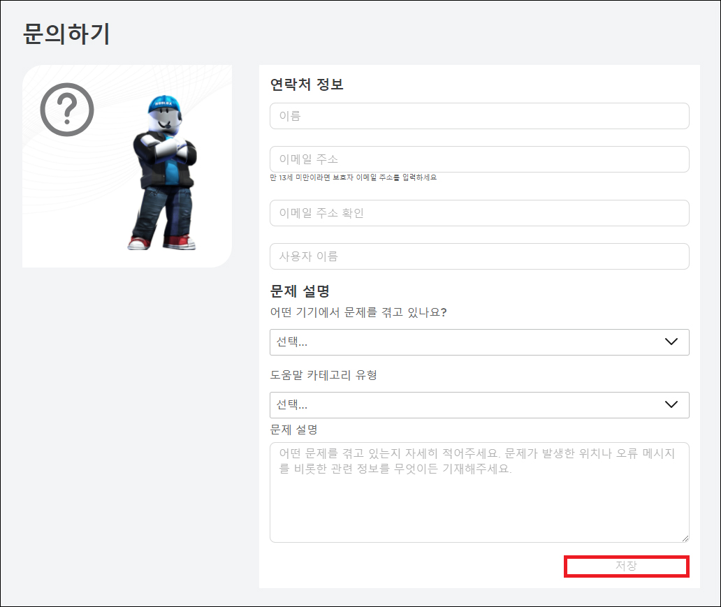 이후 문제 설명란에 어떤 문제를 겪고 있는지 자세하게 적으면 될 것이며 문제가 발생한 위치, 오류 메시지를 비롯하여 관련 정보를 무엇이든 기재하면 된다고 안내되어 있으니 현재 겪고 있는 상황에 대해 상세히 입력한 다음 전체적으로 작성한 내용을 검토해보고 이상 없을 경우 [저장]을 눌러 제출하세요.