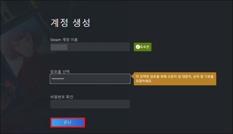돌아가서 확인하면 마지막 단계로 계정 생성의 화면이 보일 텐데 Steam 계정 이름, 암호, 비밀번호 확인에 각각 입력을 하면 되고 밑에 [끝난] 버튼을 누르면 됩니다.(계정 이름이 중복일 경우 사용할 수 없기 때문에 유효한지 확인하고 암호는 소문자 및 대문자, 숫자 및 기호를 포함하여 8자 이상 적어야 됨)