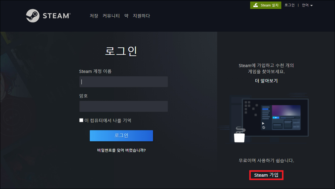 계정 정보를 입력하는 곳에 커서가 깜빡이고 있지만 우측을 보면 [Steam 가입] 버튼이 마련되어 있으니 누릅니다.