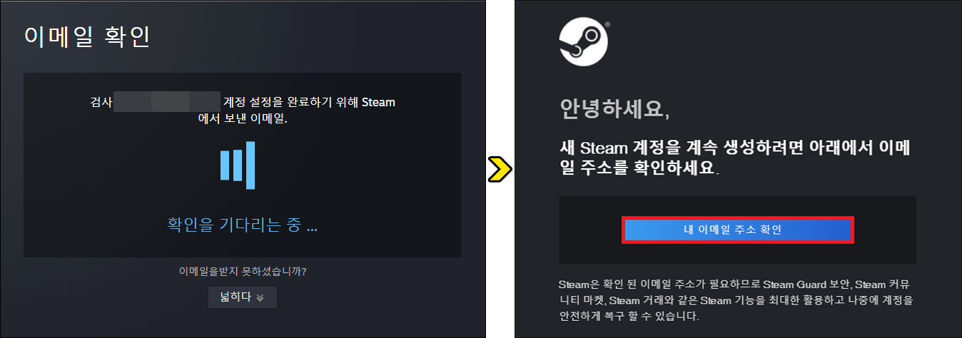 스팀에서 보낸 메일을 잠시 후 확인해보면 계정 생성을 계속하기 위해 [내 이메일 주소 확인]을 눌러야 되니 클릭하면 되고 정상적으로 처리되면 스팀 계정 만들기 창으로 돌아가서 새 Steam 계정 생성을 완료하라고 안내할 테니 추가로 열린 창은 닫아도 될 거예요.