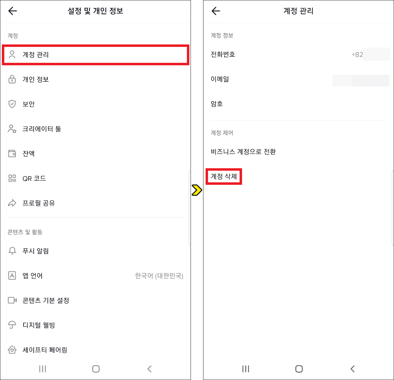그래도 안되면 계정 탈퇴를 하고 나서 다시 재가입을 해보는 방법도 있는데 마찬가지 설정 및 개인 정보 화면을 열면 [계정 관리]를 찾을 수 있으니 선택합니다.