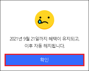 이후 언제까지 혜택이 유지되고 자동 해지되는지 다시 한번 더 알릴 텐데 [확인]을 눌러 완료하면 됩니다.