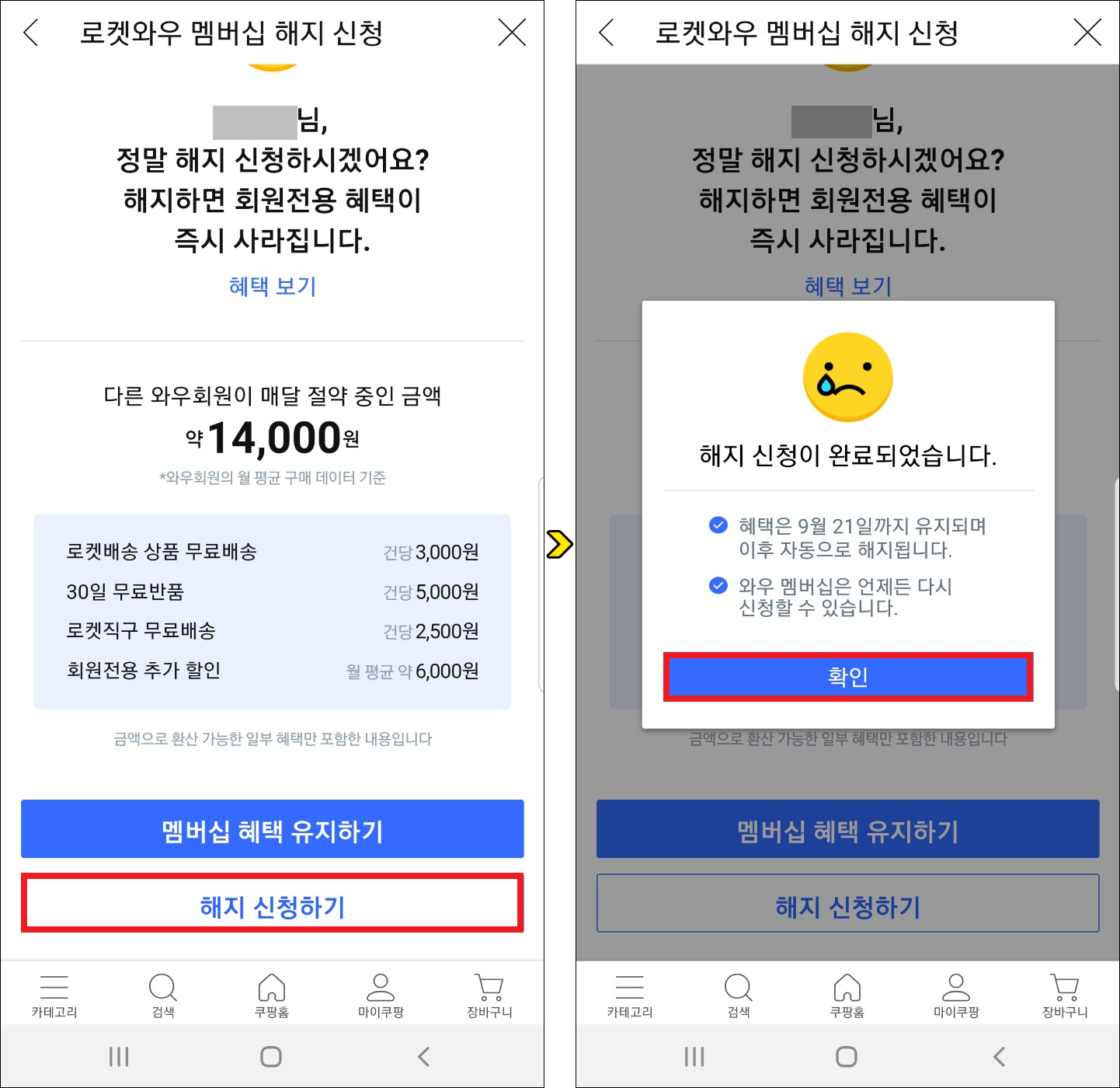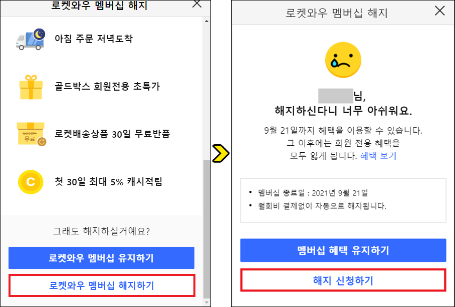 이제 언제까지 혜택을 더 이용할 수 있는지 알려줄 것이며, 멤버십 기간이 만료되면 회원 전용 혜택을 모두 잃게 된다고 알려줄 텐데 결정에 변함이 없을 경우 [해지 신청하기]를 눌러주세요.