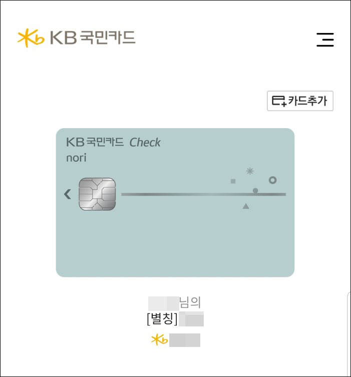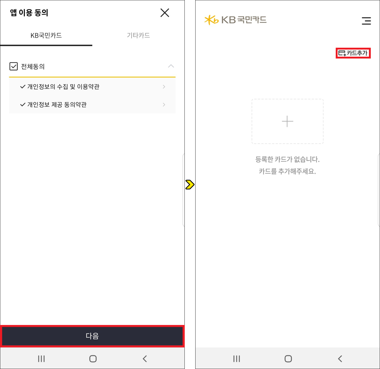 다음 단계로 앱 이용 동의와 관련된 개인정보 수집 및 이용약관과 개인정보 제공 동의약관을 볼 수 있는데 읽어본 후 전체동의한 상태에서 [다음]을 눌러 넘어가면 되고 바뀐 화면에서 등록한 카드가 없다고 나올 테니 우측 상단에 있는 [카드추가]를 누르세요.