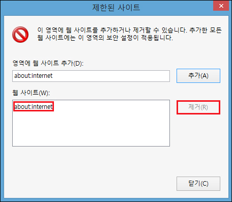 예를 들어 특정 사이트 접속불가인 곳이이'about:internet'이라고 가정했을 때 about:internet을 선택하고 [제거]를 누르면 되는 방식이니 특별히 어려운 건 없을 거예요.